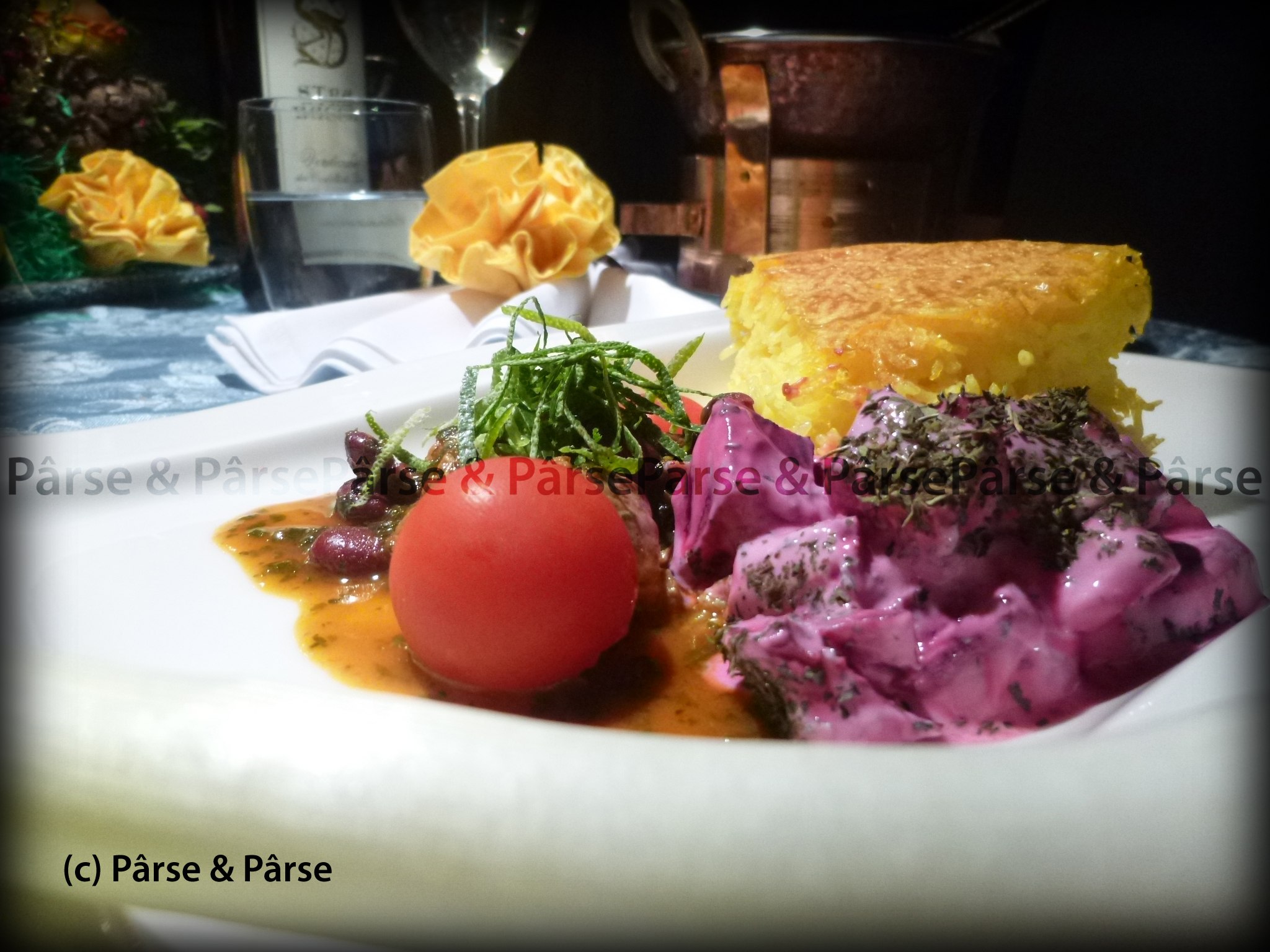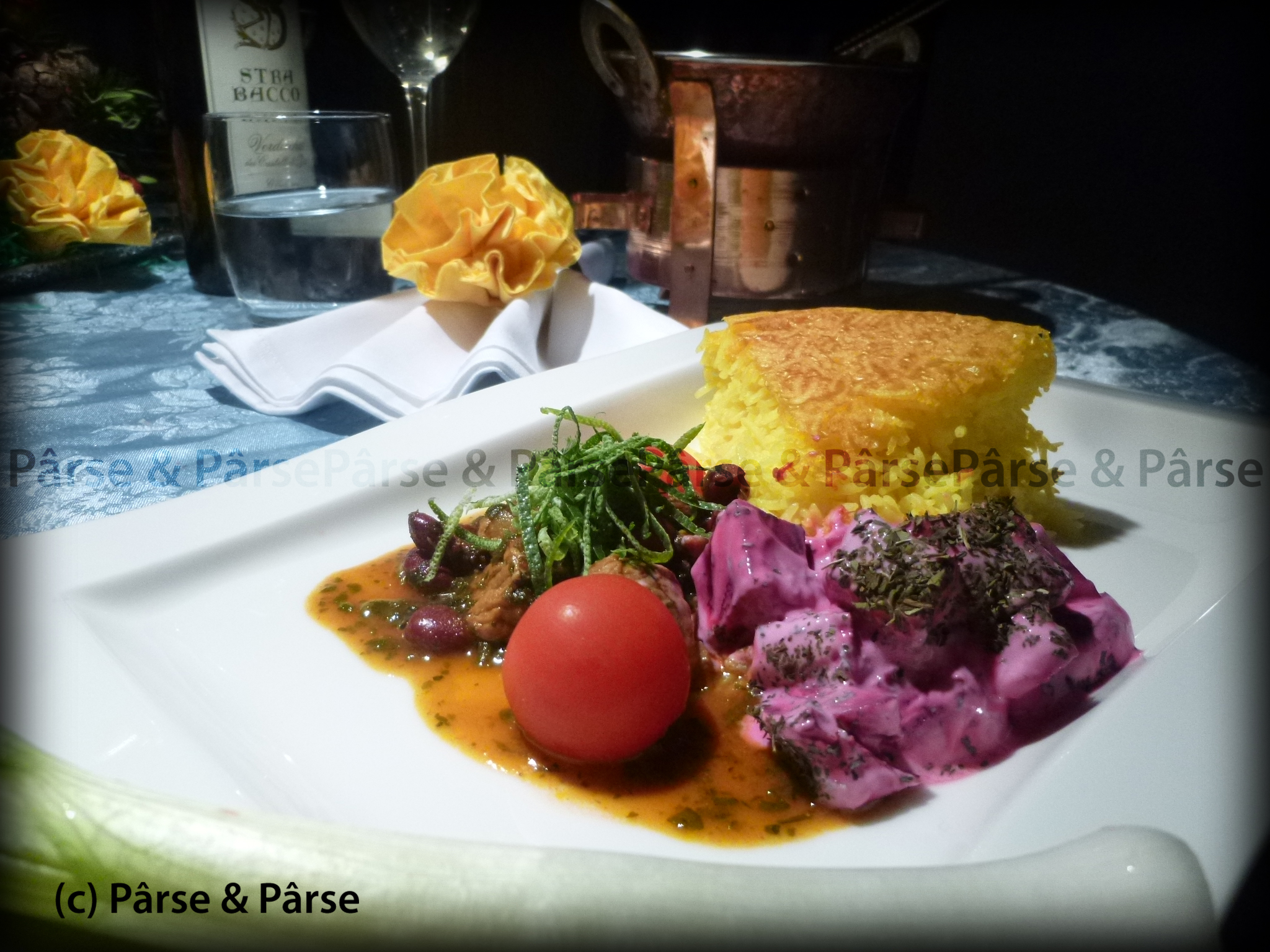 Kalbsragout in Kräutersauce an Rote Beete Joghurt mit Minze und Safran-Basmati-Krusten Reis