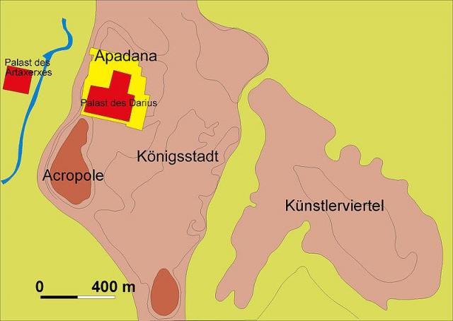Unter diesen königlichen Bekleidungen, die im königlichen Museum aufbewahrt wurden, gab es einen purpurnen königlichen Mantel, von dem die Griechen dachten, dass dieser Mantel einst Kyros dem Großen gehörte. Plutarch schrieb, „dass der Mantel trotz seines Alters von 190 Jahren immer noch wie am ersten Tag aussah.“ Er schrieb, „dass der Wert des Mantels sich auf ca. 5000 Talente (150 Tonnen Gold) belief.“ Ekbatana [Hagmatâna], eine weitere Hauptstadt der Achämeniden und laut Xenophon Sommerresidenz der achämenidischen Könige, war einer der einflussreichsten Städte des vor-achämenidischen Iran und Residenz der medischen Könige gewesen. Sie war ein wichtiger Verkehrsknotenpunkt des Persischen Reiches. Die Königsstraße führte vom persischen Kernland in das reiche Baktrien durch Ekbatana und eine zweite Straße quer durch das Zagrosgebirge verband die Stadt direkt mit Mesopotamien. Diese Straße führte, direkt hinter Ekbatana, an den Darius- und Xerxes-Inschriften von Ganj Nameh vorbei und passierte dann gut 100 km Luftlinie weiter südwestlich Bisotun in den Bergen Kurdistans, das durch eine Reihe persischer Königsreliefs und Inschriften Berühmtheit erlangte. Hier lag auch die Burg Sikayawautisch, in der Darius I den Usurpator Gaumata tötete, der hier seine Residenz hatte.