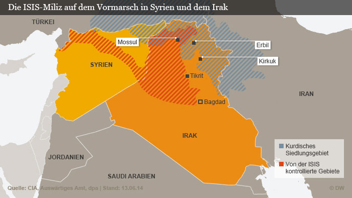 Die ISIS hat eine breite Schneise des Terrorismus im Norden und Westen des Irak in den letzten Wochen in ihrem Bestreben geschlagen, die Regierung von Ministerpräsident Nuri al-Maliki, zu stürzen, und hat die Errichtung eines islamischen Kalifats, das die Ostteile Syriens und den Norden und Westen Iraks umfasst, zum Ziel.