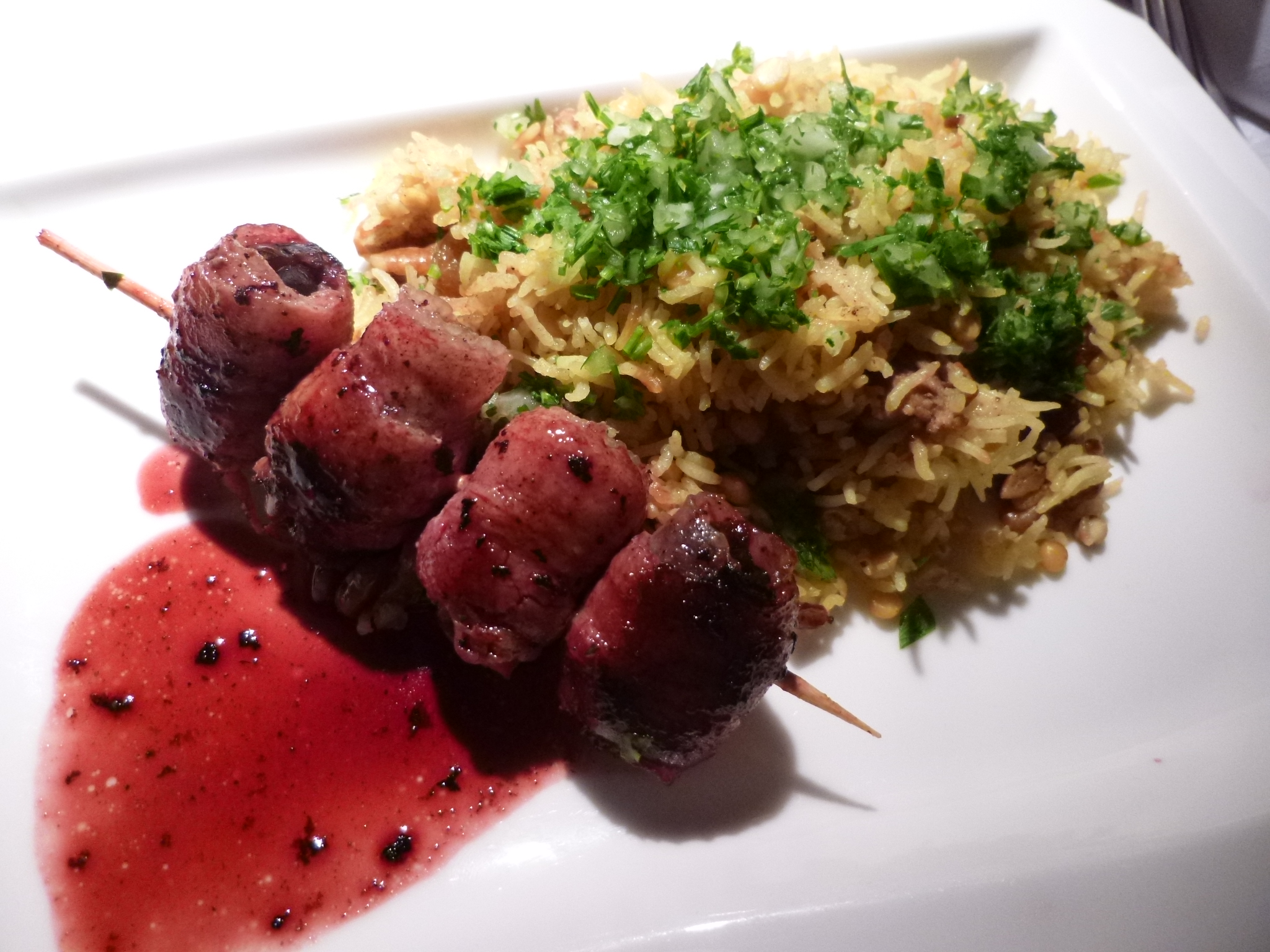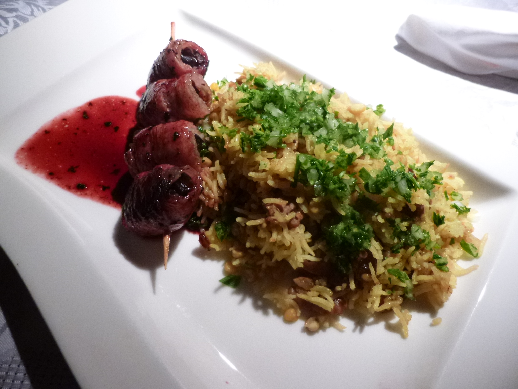 Dattelspieß im Haram-Speckmantel auf Walnuss-Linsenreis an Holunderbeeren-Zimt-Spiegel