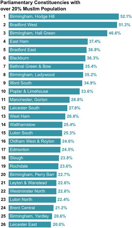 Bei Kindern im Alter von unter fünf betrug der Anstieg um mehr als 80 Prozent. Auffallend ist, dass etwas mehr als die Hälfte der Muslime in Großbritannien im Ausland geboren wurden, wobei fast drei Viertel sich ausschließlich als Briten in der Volkszählung klassifizierten. Bezeichnenderweise machen Muslime mehr als ein Fünftel der Bevölkerung in 26 Wahlkreisen und rund 50 Prozent in einigen Wahlkreisen aus. Es gibt auch 70 Bezirke mit einer muslimischen Bevölkerung von 40 Prozent und mehr.