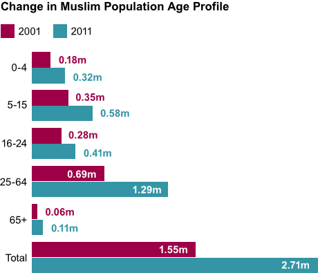 Auch die Einwanderung führte in der Vergangenheit zu einem Wachstum, es ist das dramatisch jüngere Altersprofil der muslimischen Bevölkerung, die den größten Einfluss in der Zukunft haben könnte. In einer Zeit, in der die heutige breite britische Bevölkerung schnell altert, sind die Hälfte der britischen Muslime in einem Alter von unter 25 Jahren und ein weiteres Drittel unter 15 Jahre alt. Insgesamt bezeichneten sich 2,7 Millionen Menschen, die in England und Wales bei einer Volkszählung im Jahr 2011 erfasst wurden, als Muslim und weitere 81.000 Menschen in Schottland und Nordirland ebenso.