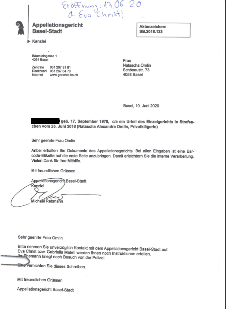 Alexander Dorin: Ich musste mich aufgrund dieses Bedrohungsbesuches von der Rockerabteilung der Polizei Basel-Stadt zuerst ein wenig beruhigen und bin deswegen zur Erholung nach Serbien gefahren. Zwischenzeitlich kontaktierte mich mein Mieter, der offenbar auch noch weitere Informationen erhalten hatte. Gemäß einem Schreiben des Appellationsgerichtes Basel-Stadt vom 10. Juni 2020 , sind in die sog. „Rocker Connection“ wohl auch zwei Richterinnen des Appellationsgerichts Basel-Stadt involviert. Dabei handelt es sich um die SP Richterinnen Eva Christ und Gabriella Matefi, wobei letztere kürzlich von dem Amt der Bürgerrätin der Bürgergemeinde Basel zurückgetreten ist und auch demnächst Ihren Richterposten beim Appellationsgericht Basel-Stadt wohl aufgibt. Aus diesem Schreiben, dass an die Ex-Frau meines Mieters gerichtet ist, geht jedenfalls hervor, dass das Appellationsgericht Basel-Stadt von dem Aufmarsch der Polizei vor meiner Liegenschaft Vorkenntnis besaß. Besonders bedenklich ist, dass die Ex-Frau meines Mieters in dem Brief des Appellationsgerichts dazu aufgefordert wurde, den Brief nach dem Durchlesen zu vernichten! Unterschrieben wurde der Brief vom Kanzleileiter des Appellationsgerichts Michael Rebmann. Nicht minder brisant ist die Tatsache, dass die Ex-Frau meines Mieters im Brief dazu aufgefordert wurde, dass sie sich bei Gabriella Matefi und Eva Christ melden solle, da sie von den beiden Frauen noch ‚instruiert’ werden müsse. Weshalb sollte die Frau von Richterinnen des Appellationsgerichts Basel-Stadt instruiert werden, ihr ehemaliger Mann aber nicht?