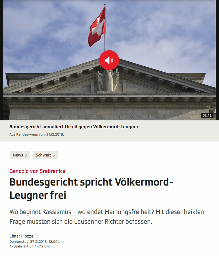 Der Tessiner Politiker Donatello Poggi bezeichnete die offizielle Darstellung der Ereignisse von Srebrenica in einem Artikel der Zeitung Corriere del Ticino vom 23. 11. 2015 als Propagandalüge. 2018 sprach ihn das Schweizer Bundesgericht des Vorwurfs der Genozidleugnung frei. Was soll es demnach bringen, wenn unseriöse Journalisten wie Christian Mensch einen Enthüllungsautor wie Alexander Dorin diffamieren? Denkt er etwa, dass Dorin dadurch auch nur ein Buch weniger verkaufen wird? Denn immerhin erschienen Dorins Bücher mittlerweile in neun Auflagen und auf fünf Sprachen, während derzeit gerade ein neues Buch fertiggestellt wird. Hat man nichts aus dem Fall Daniele Ganser gelernt, dessen Popularität trotz und gerade wegen der Mainstreamhetze stetig zunimmt?