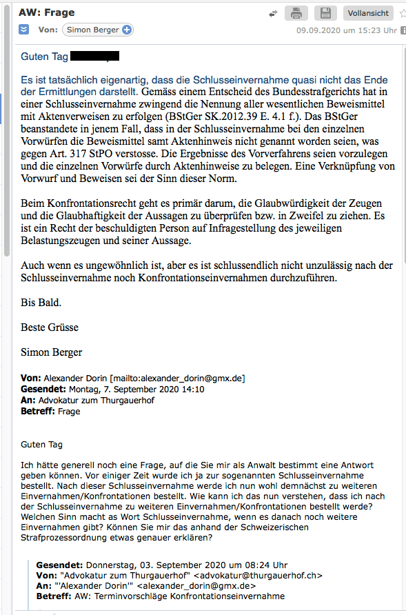 Wie nun mittlerweile sogar der mir von der Staatsanwaltschaft aufgedrängte Anwalt Simon Berger in einer E-Mail vom 09. 09. 2020 an mich einräumte, so verstösst das Verhalten des Staatsanwalts Markus Hofer erneut gegen die Schweizerische Strafprozessordnung: Ich zitiere aus der E-Mail von Simon Berger an mich: