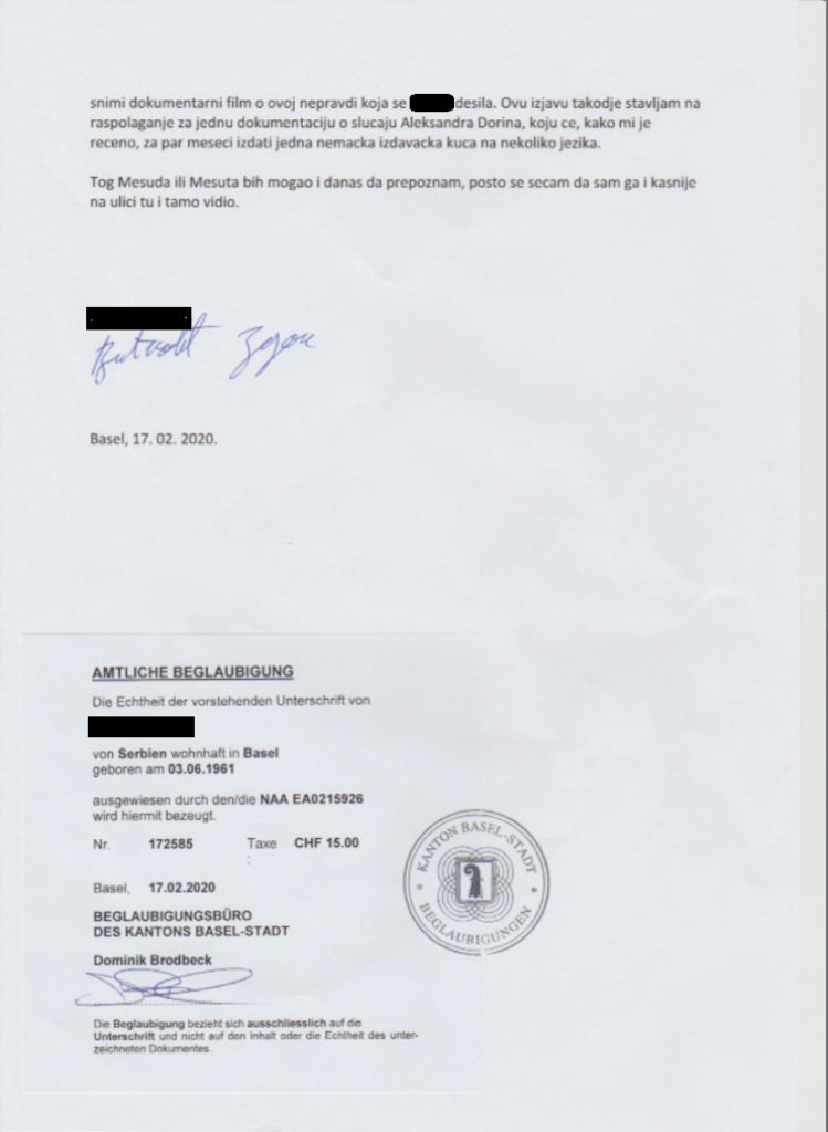 Zudem meldete sich mittlerweile auch jene Person zu Wort, die im Jahr 2005 von mir notariell dazu bevollmächtigt wurde, stellvertretend für mich das von meinen Eltern geerbte Haus in Beli Potok in der Nähe von Belgrad zu verkaufen, wie auch ein Sparkonto meiner Eltern in Belgrad aufzulösen. Zahlreiche beglaubigte Dokumente belegen, dass ich damals durch den Hausverkauf und die Kontoauflösung ca. 120’000 Euro Einnahmen hatte, wofür ich zum damaligen Eurokurs ca. 190’000 Schweizer Franken erhielt. Wie Sie vielleicht noch aus den älteren Interviews wissen, so hat die Basler Staatsanwaltschaft im Jahr 2015 den Rest dieses Erlöses in der Höhe von 90’000 Franken beschlagnahmt und rückt das illegal entwendete Geld seither nicht mehr heraus, obwohl zahlreiche Dokumente die Herkunft des Geldes einwandfrei belegen.