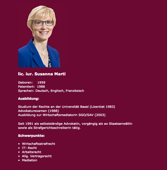 Alexander Dorin: Lässt man Mal die Tatsache weg, dass Frau Marti im vorliegenden Fall ihren Klienten gegen die Staatsanwaltschaft und das Strafgericht in keiner Weise verteidigte, so habe ich zusätzlich direkte Hinweis dafür, weshalb Frau Marti zugunsten der Basler Justiz und gegen ihren Mandanten agiert. Aus Frau Martis Biografie erfährt man z.B., dass sie früher selbst als Staatsanwältin und auch als Gerichtsschreiberin tätig war. Da haben wir eine Erklärung dafür, weshalb sie gegen ihre ehemaligen Arbeitsgeber nicht vorgehen möchte und deren Machenschaften sogar gutheißt.